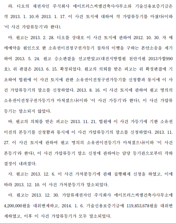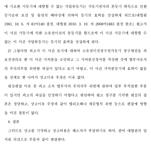 아쉬운 점은 등기관이 등기신청을 각하처분한 것에 대하여 가압류등기말소등기신청각하처분취소소송을 하였다면 당연히 승소했을 사안인데 이를 간과하고 가처분 이후에 등기되어 있던 가압류등기를 말소하기 위하여 가압류권자에게 대위변제하면서 불필요한 돈을 지출하였다는 점입니다.