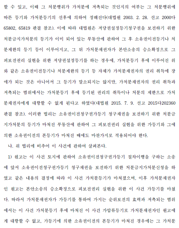 부동산에 관하여 처분금지가처분의 등기가 된 후에 가처분채권자가 본안소송에서 승소판결을 받아 확정되면 그 피보전권리의 범위 내에서 가처분 위반행위의 효력을 부정할 수 있고, 이때 그 처분행위가 가처분에 저촉되는 것인지의 여부는 그 처분행위에 따른 등기와 가처분등기의 선후에 의하여 정해진다(대법원 2003. 2. 28. 선고 2000다65802, 65819 판결 참조). 이에 따라 대법원은 저당권설정등기청구권을 보전하기 위한 처분금지가처분의 등기가 이미 되어 있는 부동산에 관하여 그 후 소유권이전등기나 처분제한의 등기 등이 이루어지고, 그 뒤 가처분채권자가 본안소송의 승소확정으로 그 피보전권리 실현을 위한 저당권설정등기를 하는 경우에, 가처분등기 후에 이루어진 위와 같은 소유권이전등기나 처분제한의 등기 등 자체가 가처분채권자의 권리 취득에 장애가 되는 것은 아니어서 그 등기가 말소되지는 않지만, 가처분채권자의 권리 취득과 저촉되는 범위에서는 가처분등기 후에 등기된 권리의 취득이나 처분의 제한으로 가처분채권자에게 대항할 수 없게 된다고 하였다(대법원 2015. 7. 9. 선고 2015다202360 판결 참조). 이러한 법리는 소유권이전청구권가등기 청구채권을 보전하기 위한 처분금지가처분의 등기가 마쳐진 부동산에 관하여 그 피보전권리 실현을 위한 가등기와 그에 의한 소유권이전의 본등기가 마쳐진 때에도 마찬가지로 적용되어야 한다.
