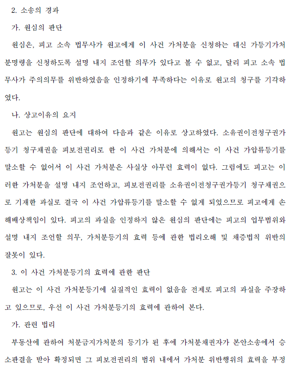 [피고의 구성원 법무사로부터 조언을 받고 가처분등기를 마친 원고가, 법무사의 조언이 잘못된 것임을 이유로 피고에게 손해배상을 구한 사안에서, 소유권이전청구권가등기 청구채권을 피보전권리로 한 처분금지가처분등기의 효력에 관한 법무사의 조언이 잘못된 것인지가 문제된 사건]